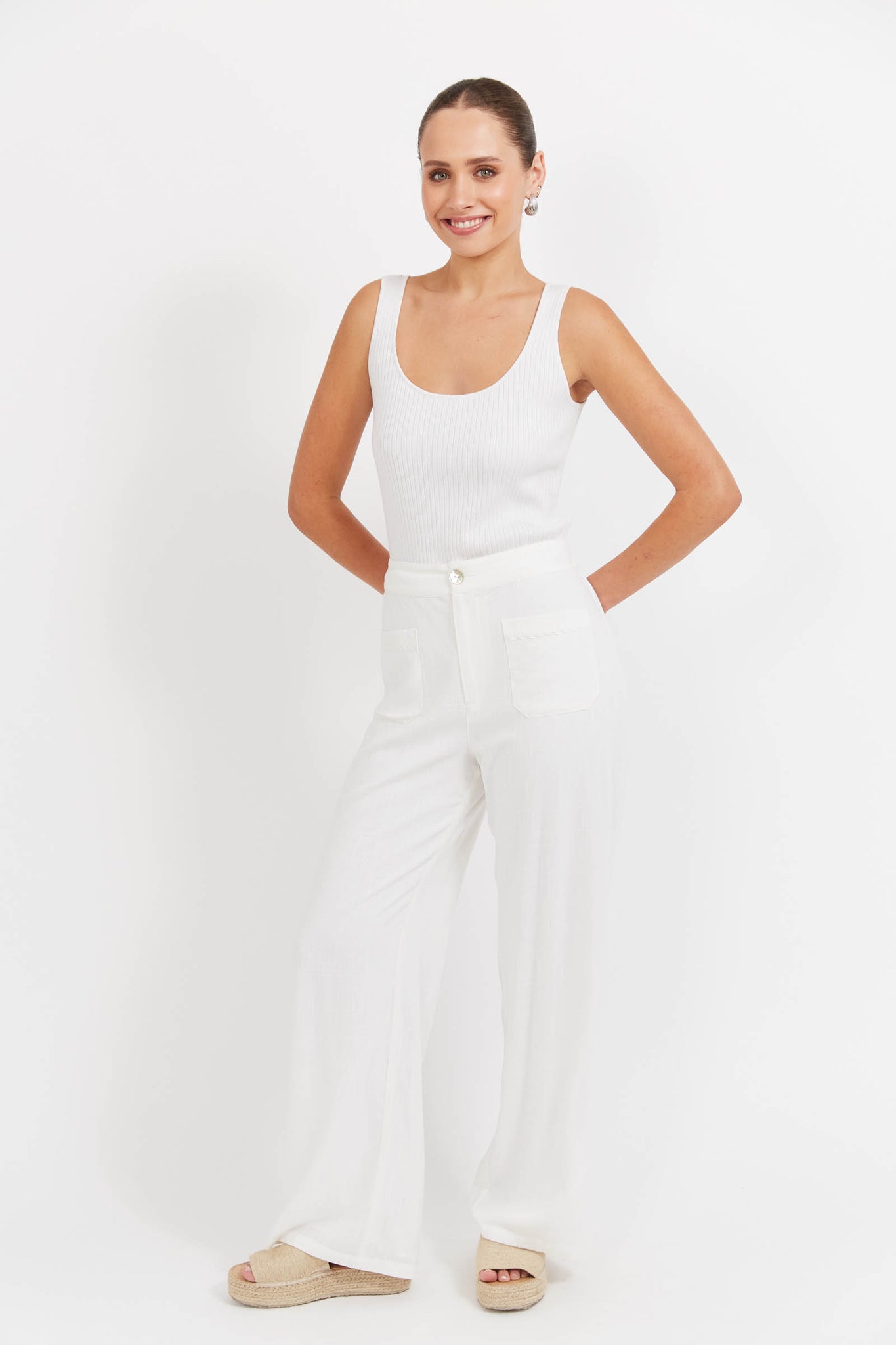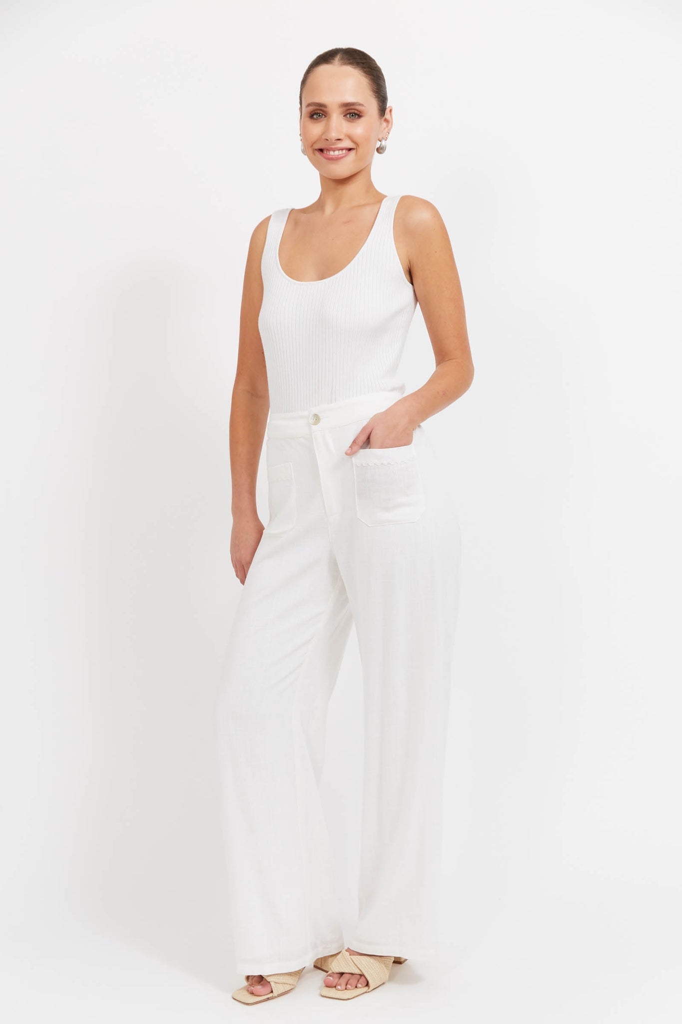 Vintage feel, modern cut. The Haiti Pant is a full-length summer staple with a flattering straight-leg silhouette and thoughtful nostalgic touches. Designed with a front button and fly closure, elasticated back waistband, and front patch pockets trimmed with playful ric-rac detailing.