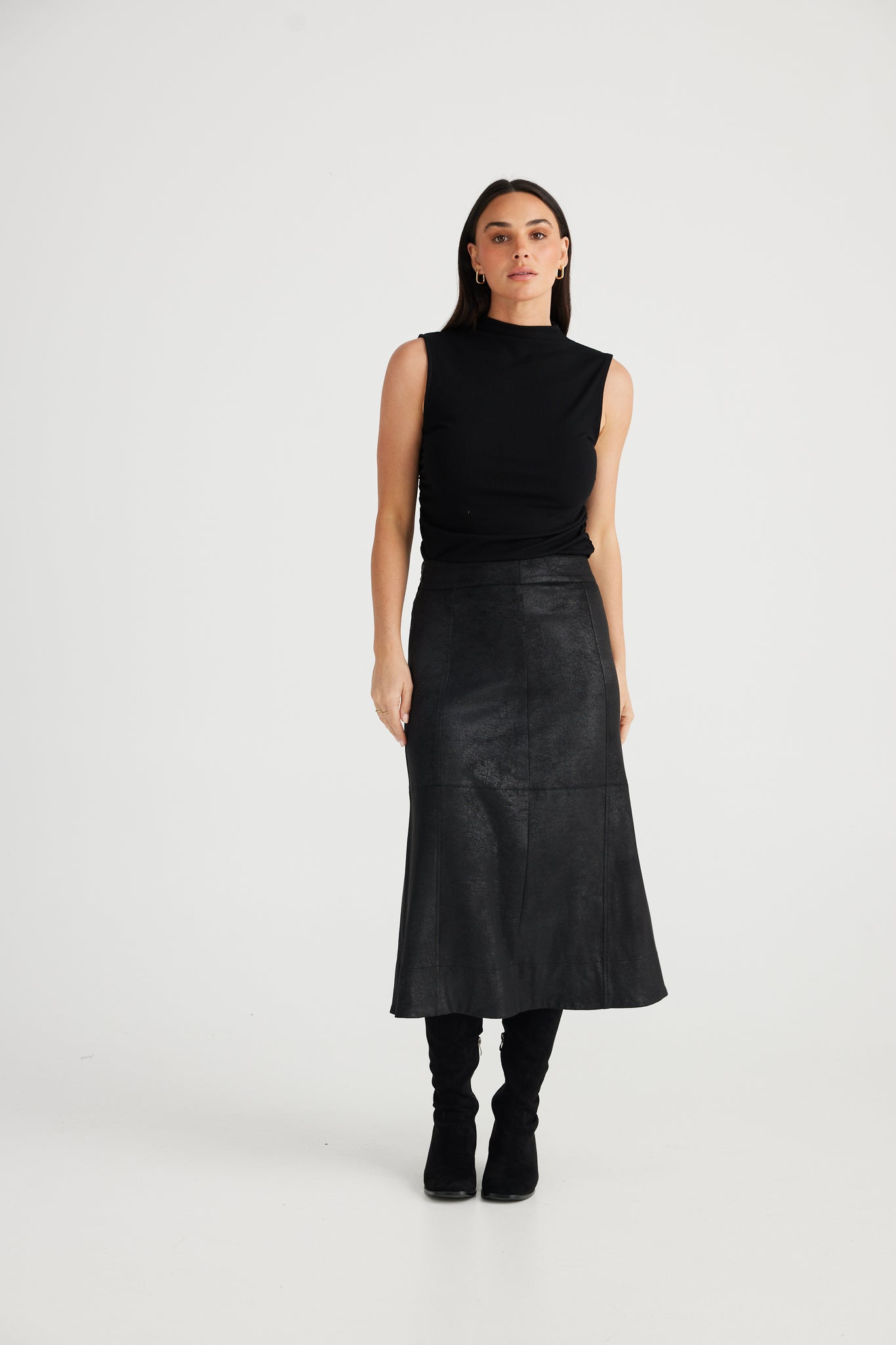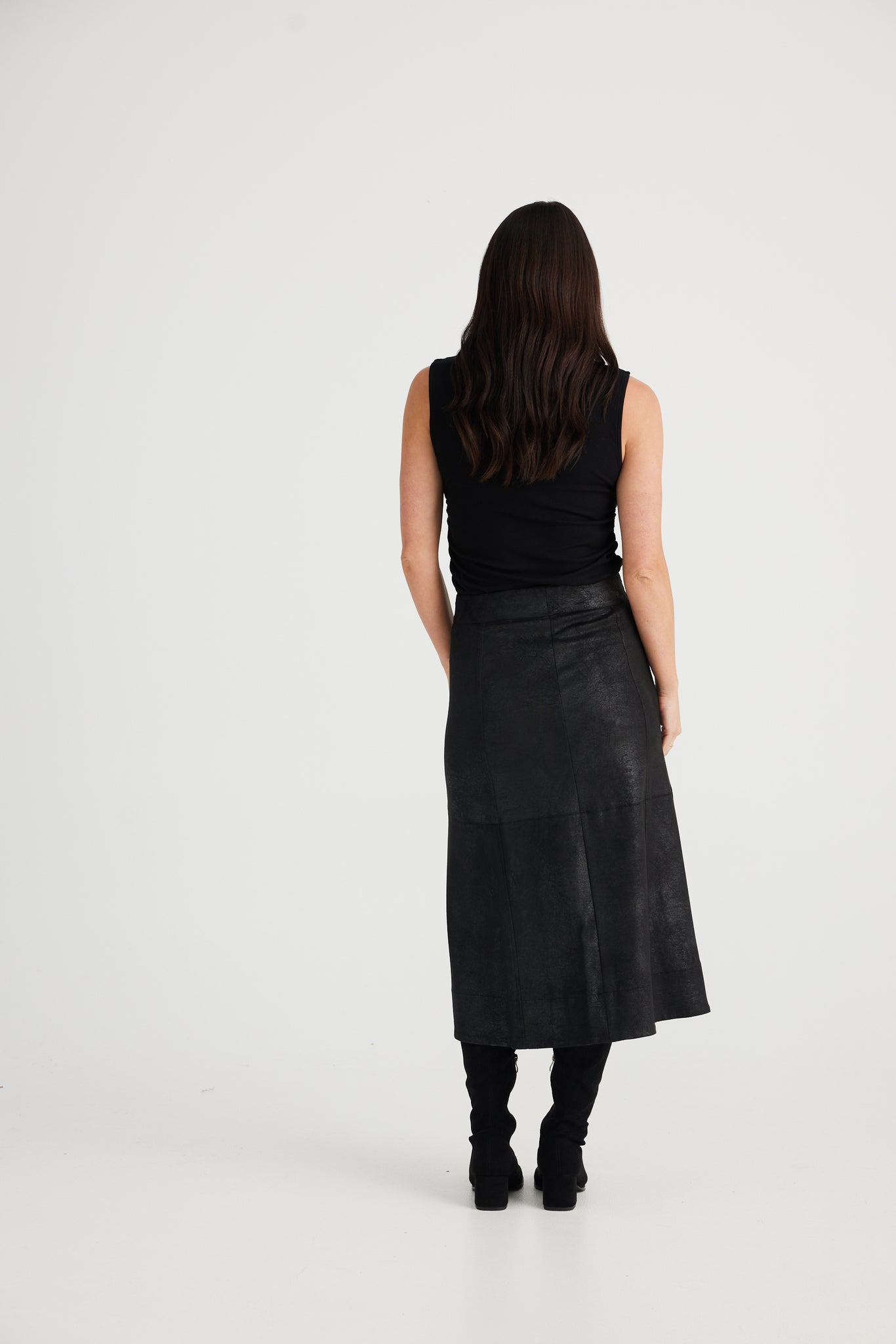 Introducing the Wilson Skirt, a symbol of understated elegance. Made from a vintage distressed fabric, this midi skirt features a wide waistband, design seams, and exposed zip for a subtle touch of sophistication. With top stitching details, it's a timeless piece that will elevate any outfit.