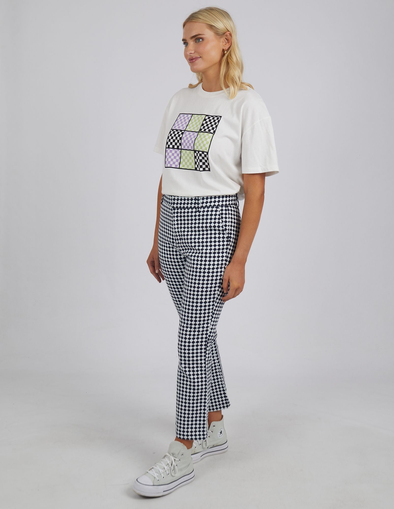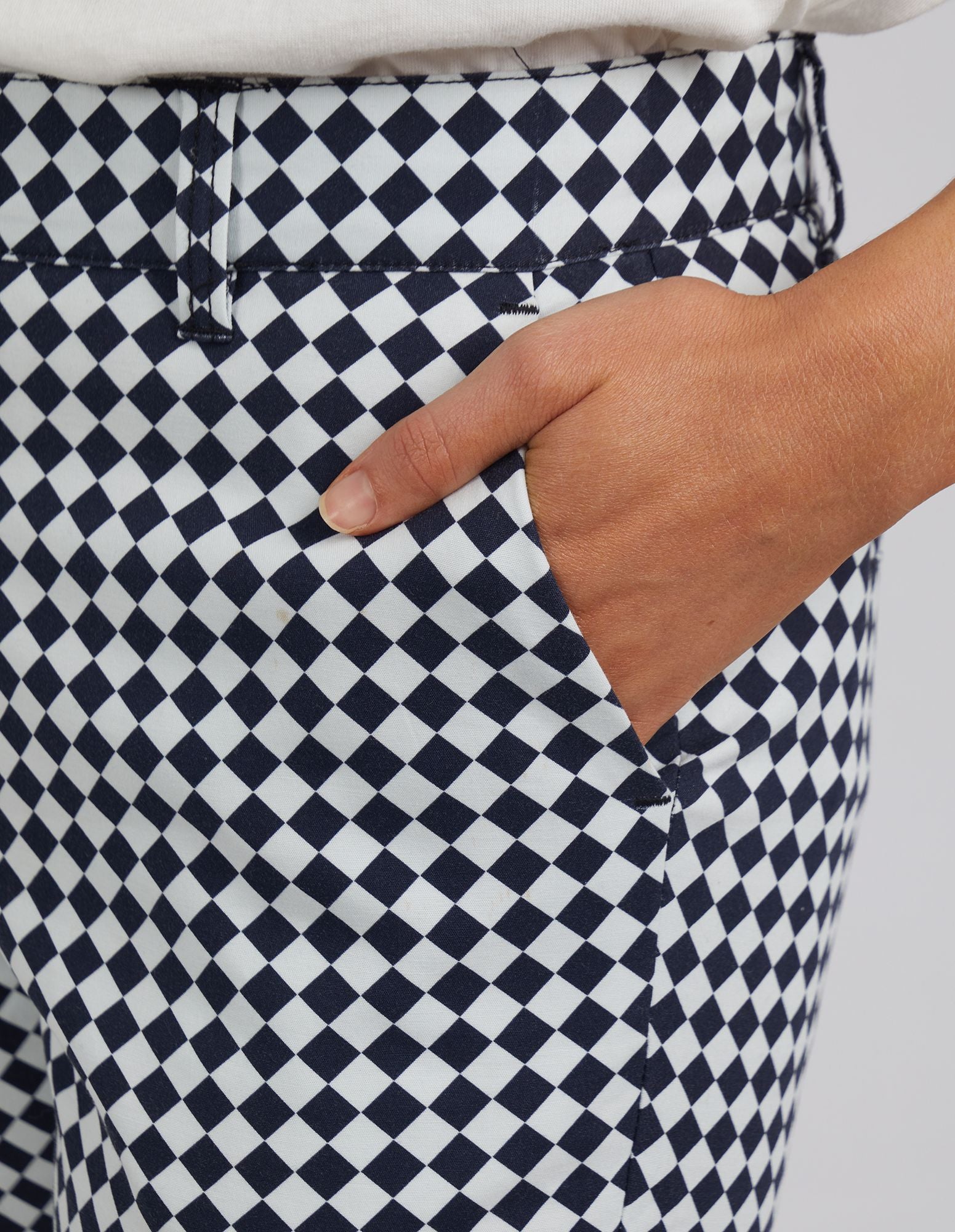 The Elm Zest Pant adds a touch of retro-inspired style to your wardrobe. Crafted from a stretch woven cotton blend, this navy checkerboard print pant is designed for all-day comfort. Its slightly flared leg gives a chic, modern look.