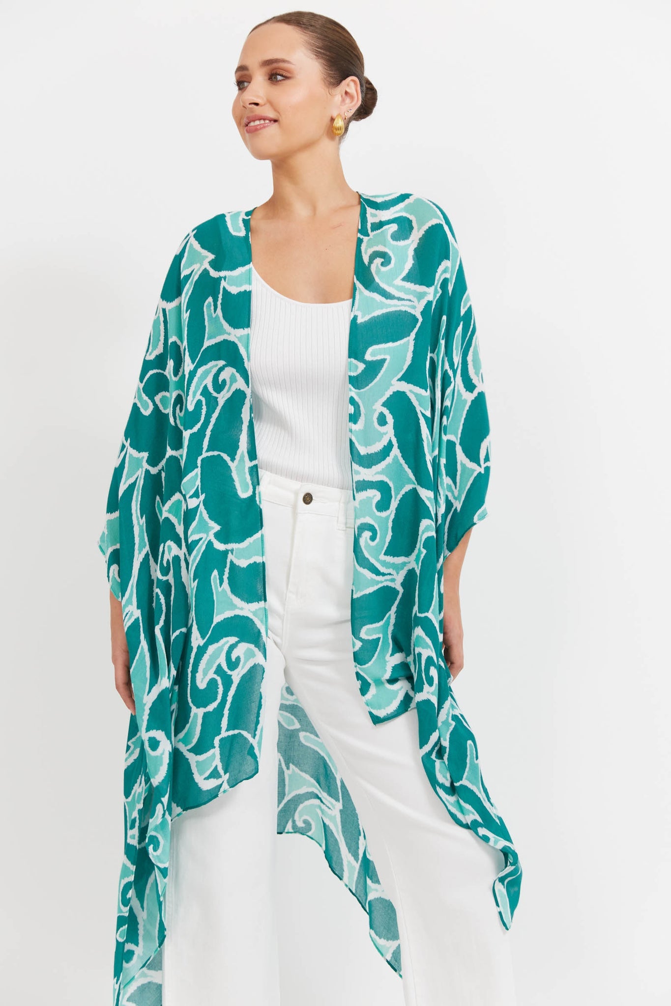 A light layer with a bold touch. These Capes are your go-to for easy sun coverage - whether thrown over swimwear or styled with everyday pieces. Featuring an open-front design, 3/4 length sleeves, side vents, and a flowing handkerchief hem, it adds movement without the bulk. Crafted in a semi-sheer, shell-inspired print. Made with 100% Rayon
