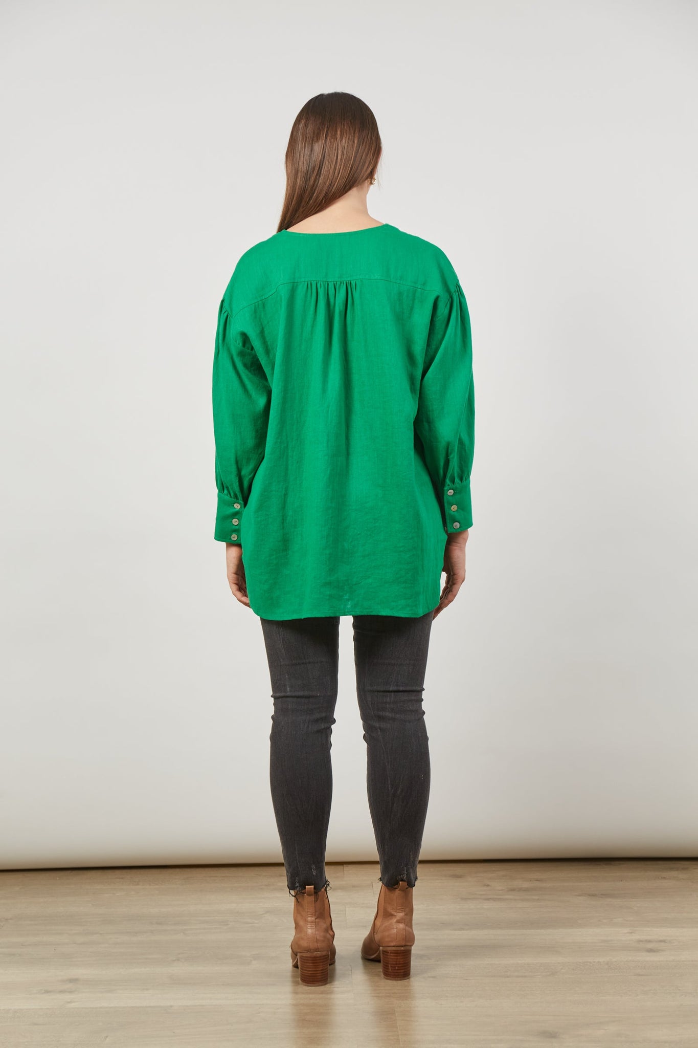 Meet your new favourite basic: the Panorama Blouse. Light and breezy, our updated classic linen shirt offers a roomier fit and hip-length silhouette. Crafted from a linen-cotton blend, it features a flattering V-neck, dropped shoulder, and a curved high-low hem. Transition effortlessly from sophisticated to relaxed by wearing it loosely over wide-leg pants with sneakers or loafers.