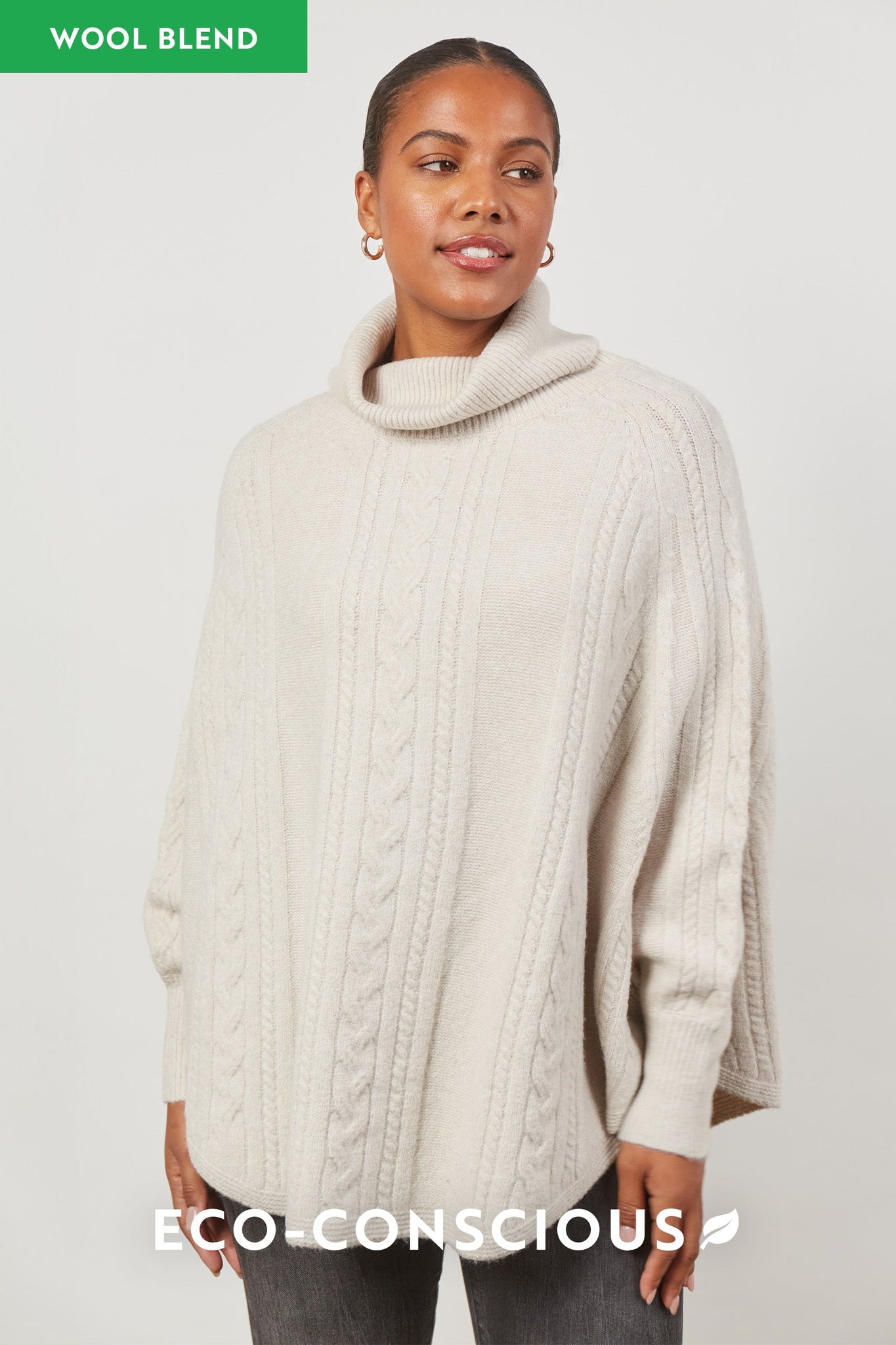 The Renew Poncho, a versatile piece for the cooler months, boasts a heavy knit crafted from a wool and recycled blend. With a stylish turtleneck, batwing sleeves, and a curved hem, it effortlessly transitions from lunch outings to office days or evening cocktails. Throw it over leggings with loafers or boots and stunning metal accents.