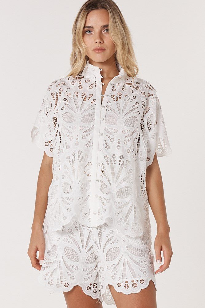 The Elara Broderie Blouse is a study in quiet luxury. Featuring a flattering high neckline, relaxed fit and included camisole, it’s adorned with intricate broderie detailing. Elegant and transeasonal, it pairs perfectly with tailored or casual separates.