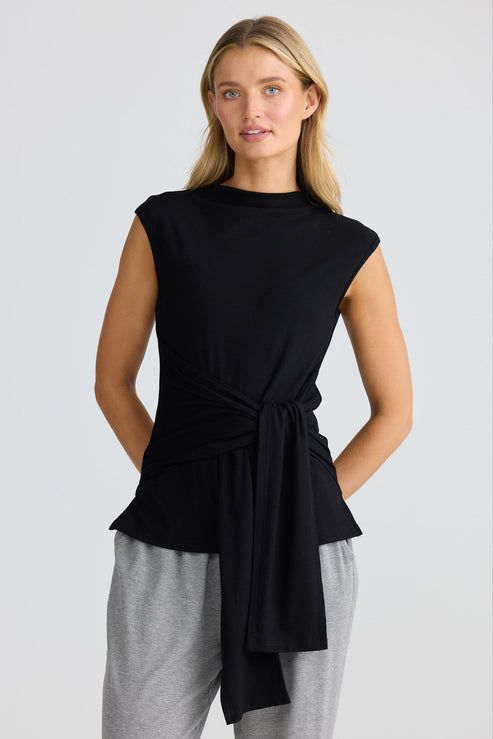 The Fast Forward Top combines understated elegance with effortless versatility. Featuring a refined high neckline and sleeveless silhouette, this piece offers a polished foundation for any wardrobe. The adjustable tie-up detail adds a touch of contemporary flair, allowing you to customize the fit to suit your preference. Crafted from soft jersey fabric, it drapes beautifully while maintaining a standard fit that works seamlessly from day to evening. A timeless essential that transcends seasons.