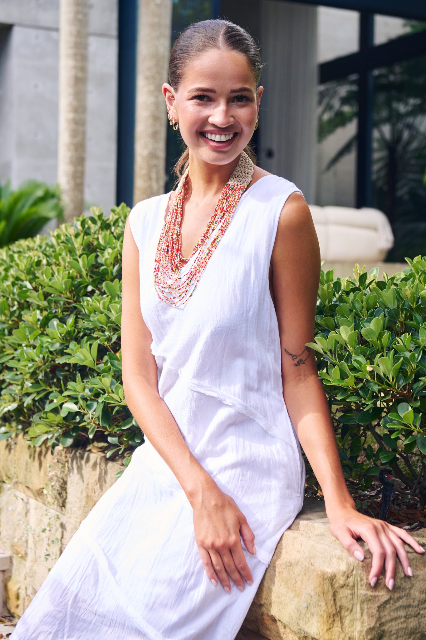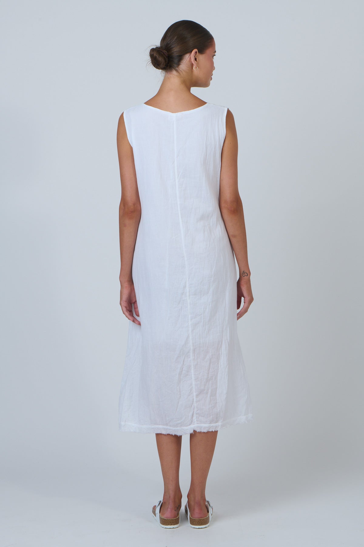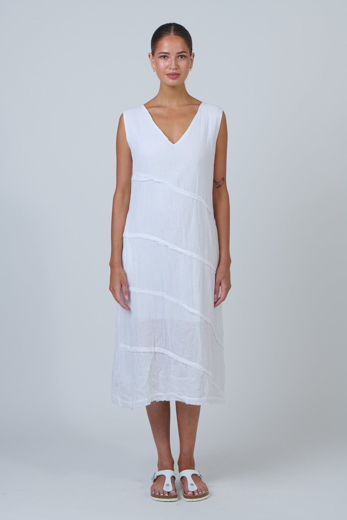 Where casual meets considered. This sleeveless midi dress is all about that sweet spot between polished and pleasantly imperfect. The flattering V-neckline pairs beautifully with diagonal frayed seams that build a playful tiered look with raw-edge character. Spun from 100% crinkle cotton, it's got the relaxed vibe you crave plus handy side pockets—proof that the best outfits are the ones you can actually move in.