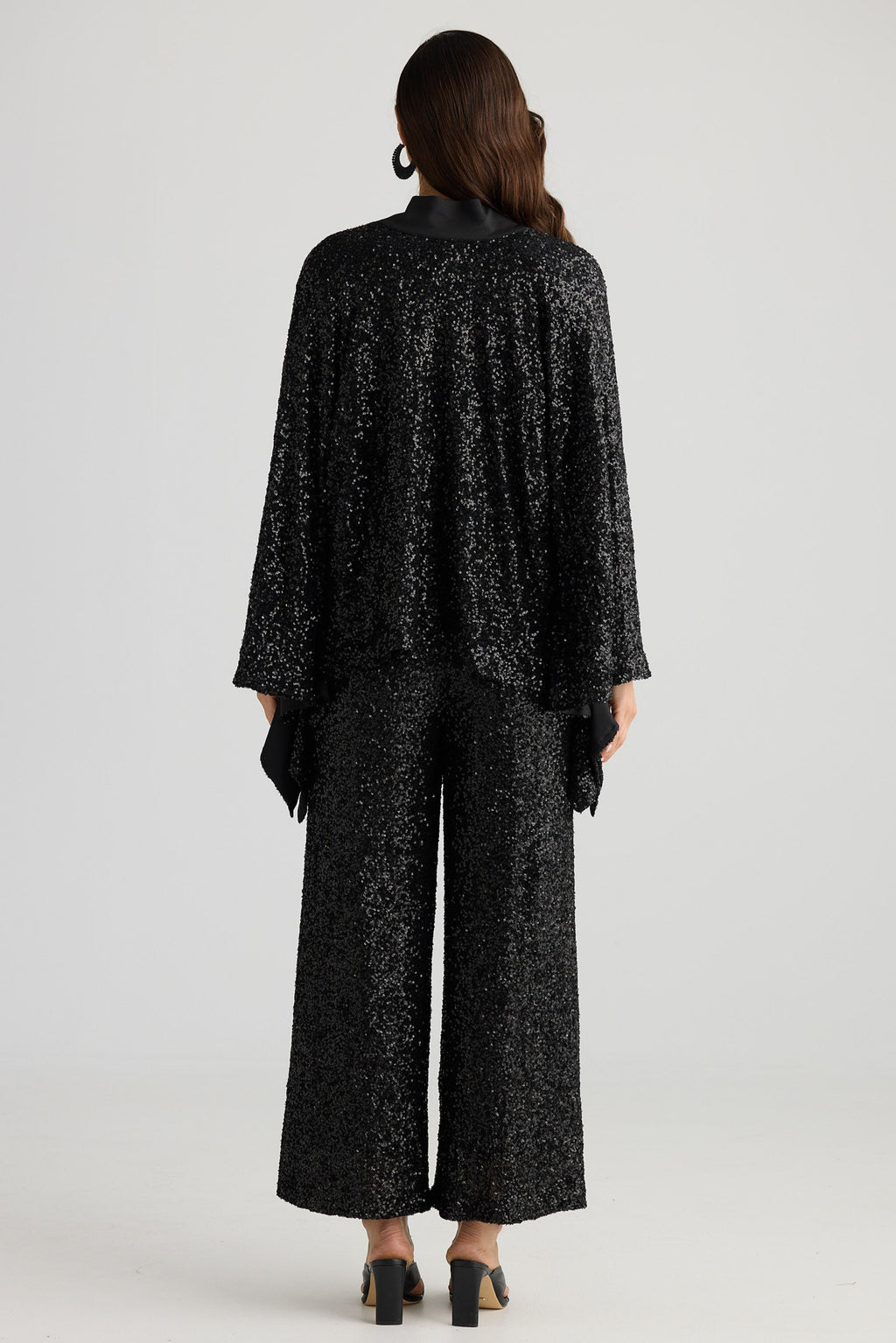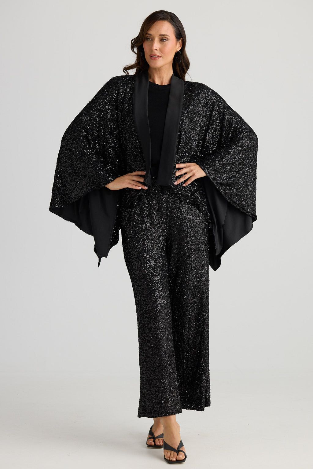 • Slip into shimmer and sass with this chic crop kimono that's ready to steal the spotlight. Crafted from eye-catching sequin fabric with a silky satin neckband for that polished finish, the Jagger is your go-to piece for turning heads. The lightweight polyester blend moves with you, while the elastane-infused lining keeps everything comfortable all night long. Perfect for layering over basics or going solo—this is the kind of statement piece that makes getting dressed feel like a celebration.