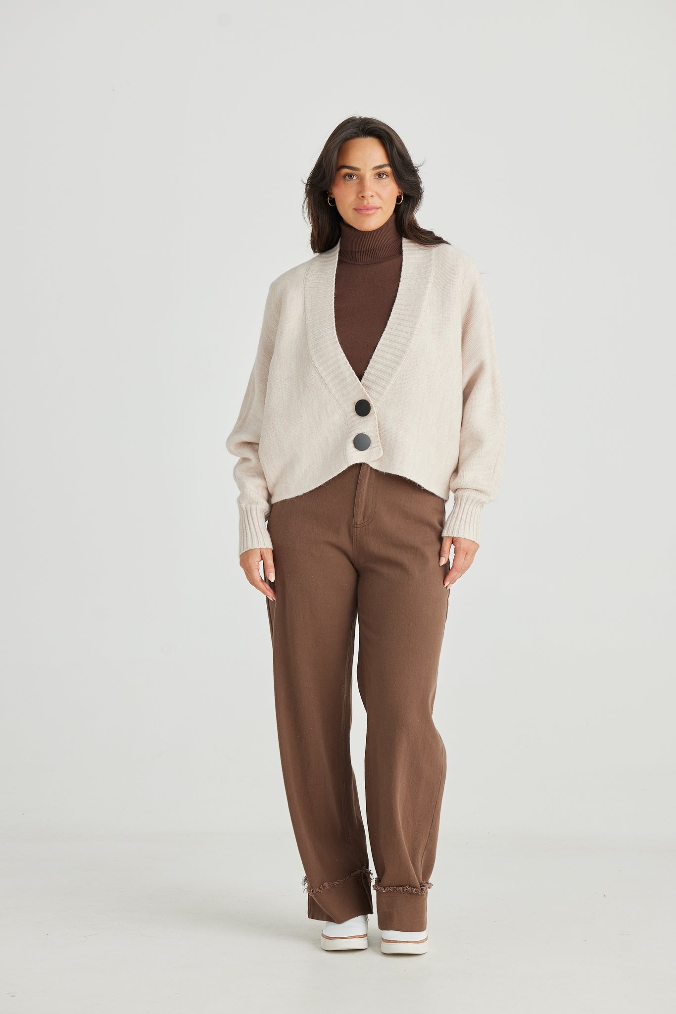 Indulge in luxury with the Fallon Cardi in Ecru. Its low V neckline and ribbing at the neckline, cuffs and hem add sophistication to your look. Layer it up or wear it on its own with its oversized, comfortable fit for ultimate versatility. Elevate your style with this must-have piece.
