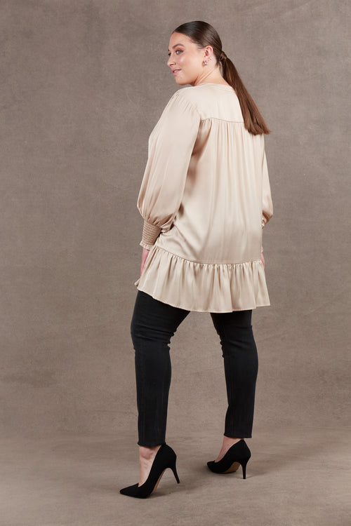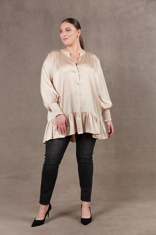 Infuse sophistication into your workwear or evening look with the Norse Blouse. The button-down design, bishop sleeves, and relaxed frill hem elevate any ensemble. Perfectly styled over leggings or fitted denim jeans, this blouse effortlessly adds a touch of sleek and smart-casual refinement to your look.