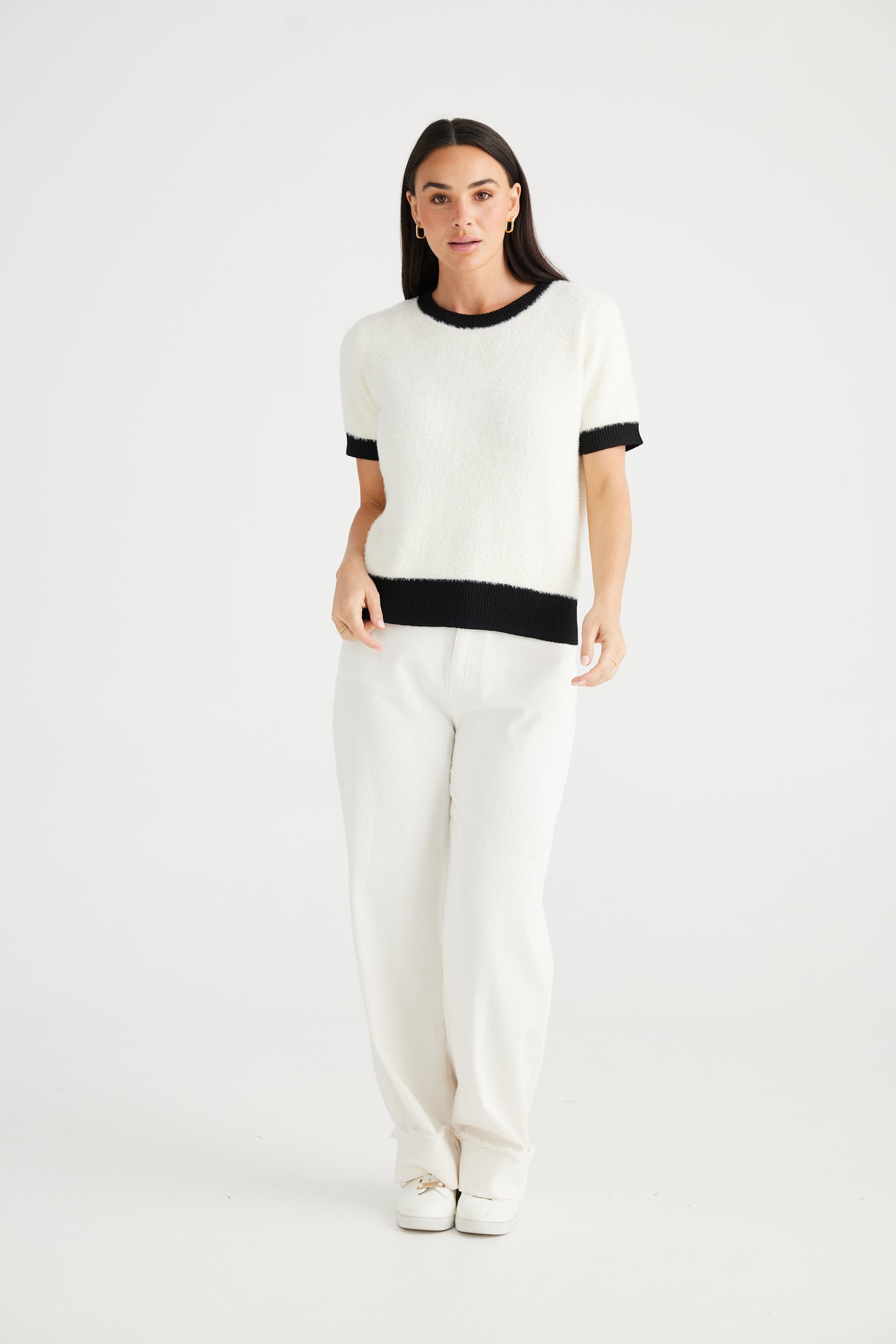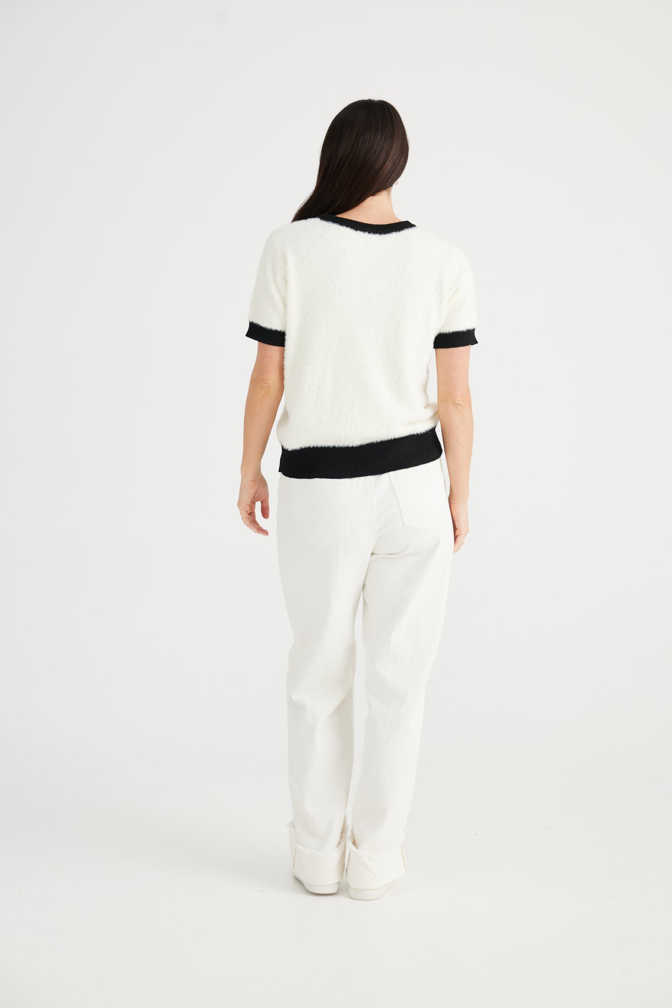 Indulge in luxury with our Tinker Knit Top. Crafted from fluffy yarn, this top features a round neckline, relaxed fit, and short sleeves for ultimate comfort. The ribbed neckline, cuffs and hem add a touch of sophistication to this must-have piece. Elevate your wardrobe with this exclusive and elegant top.