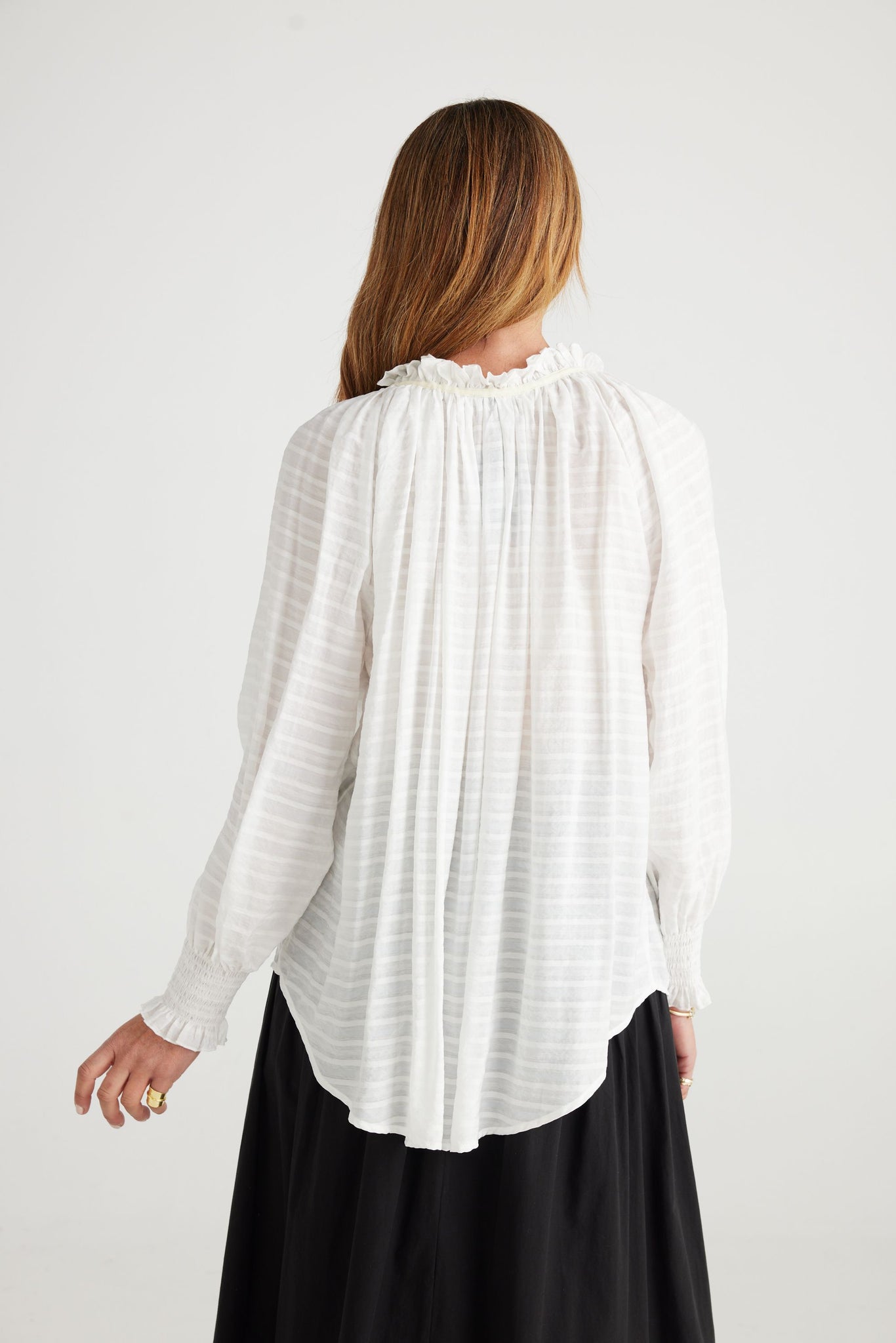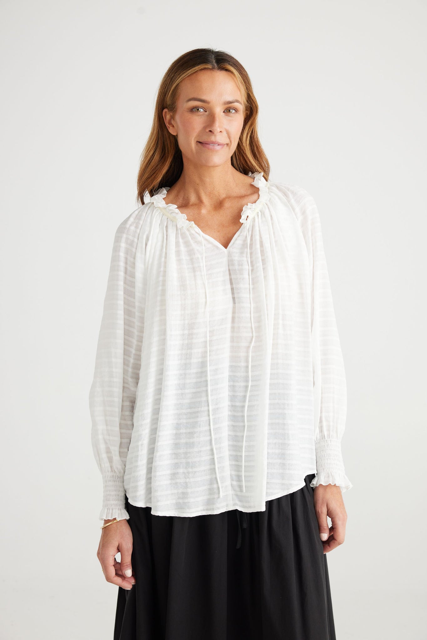 Swing into something special with this Flora Top! With a necktie and ruffle trim neckline, you'll love the fashionable flair. And the full length sleeve, with its wide shirred cuff, is a fashionista's dream! Top it all off with the curved hemline - this top is 'tie-dye' for!
