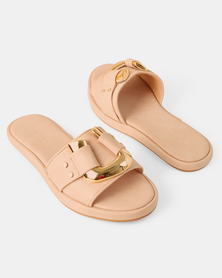 Introducing the Lucy Slide in Natural, a must-have addition to your summer shoe collection. This slide boasts a captivating statement gold buckle and harness detail, adding a touch of glamour and sophistication to your look.